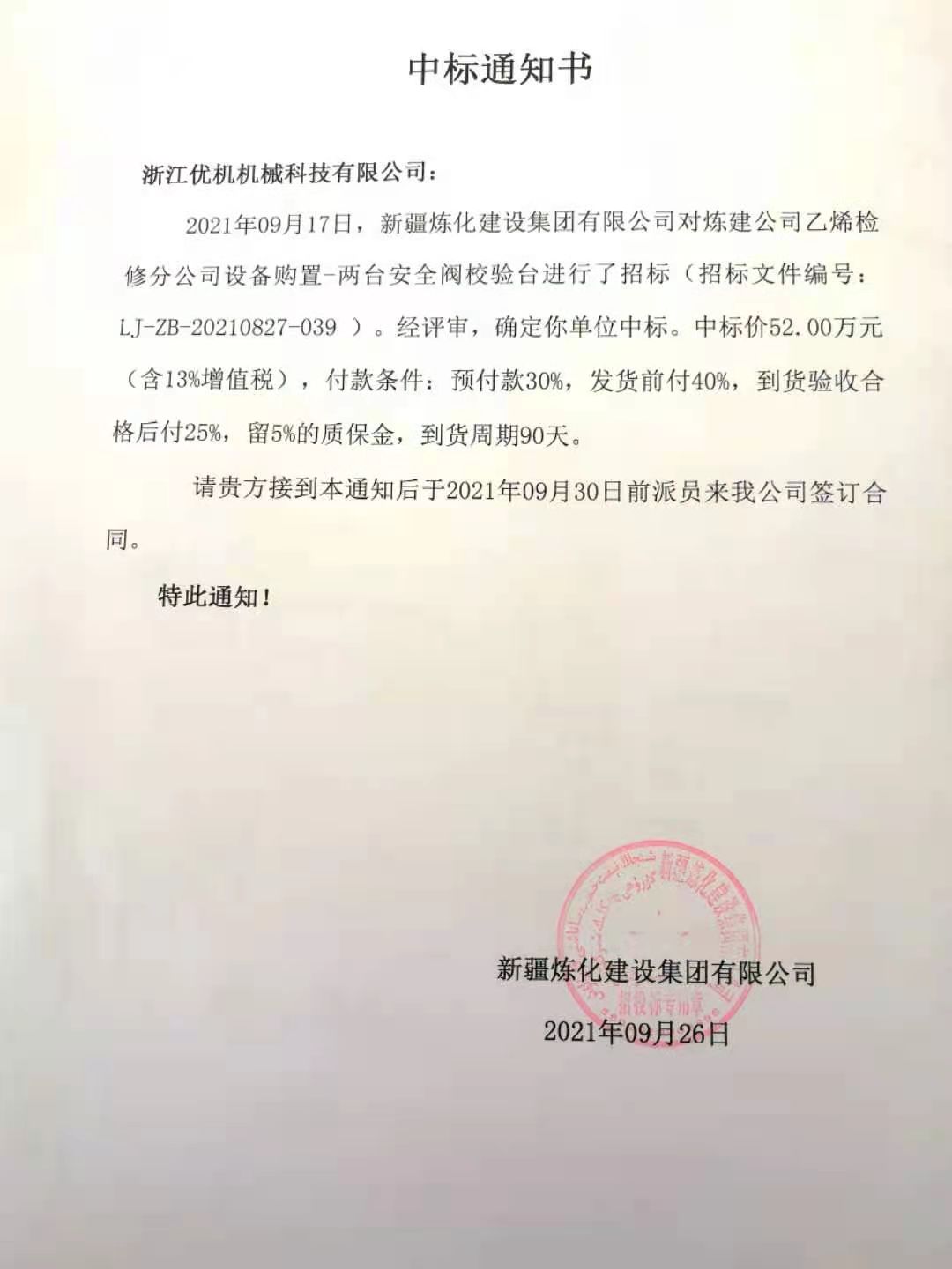 近期,新疆煉化建設(shè)集團有限公司發(fā)出中標通知書,宣布通知浙江優(yōu)機機械科技有限公司,二次添加設(shè)備購置項目-兩套安全閥校驗臺,經(jīng)評審確定中標(招標文件編號:LJ-ZB-20210827-039),合計一期和二期閥門檢測校驗設(shè)備總數(shù)達到11臺(套)金額貳佰多萬,該項目是浙江優(yōu)機機械科技有限公司主營產(chǎn)品進入中石油樣本項目。